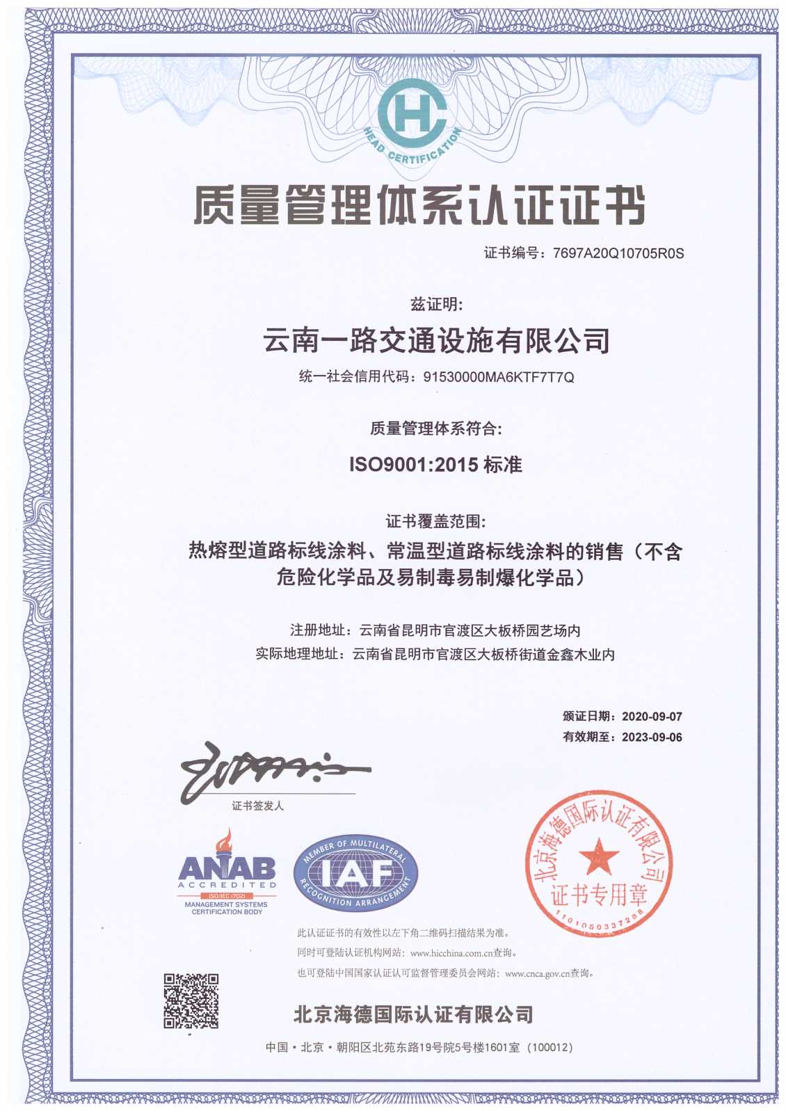 2020年通过质量管理体系IOS90012015标准质量认证